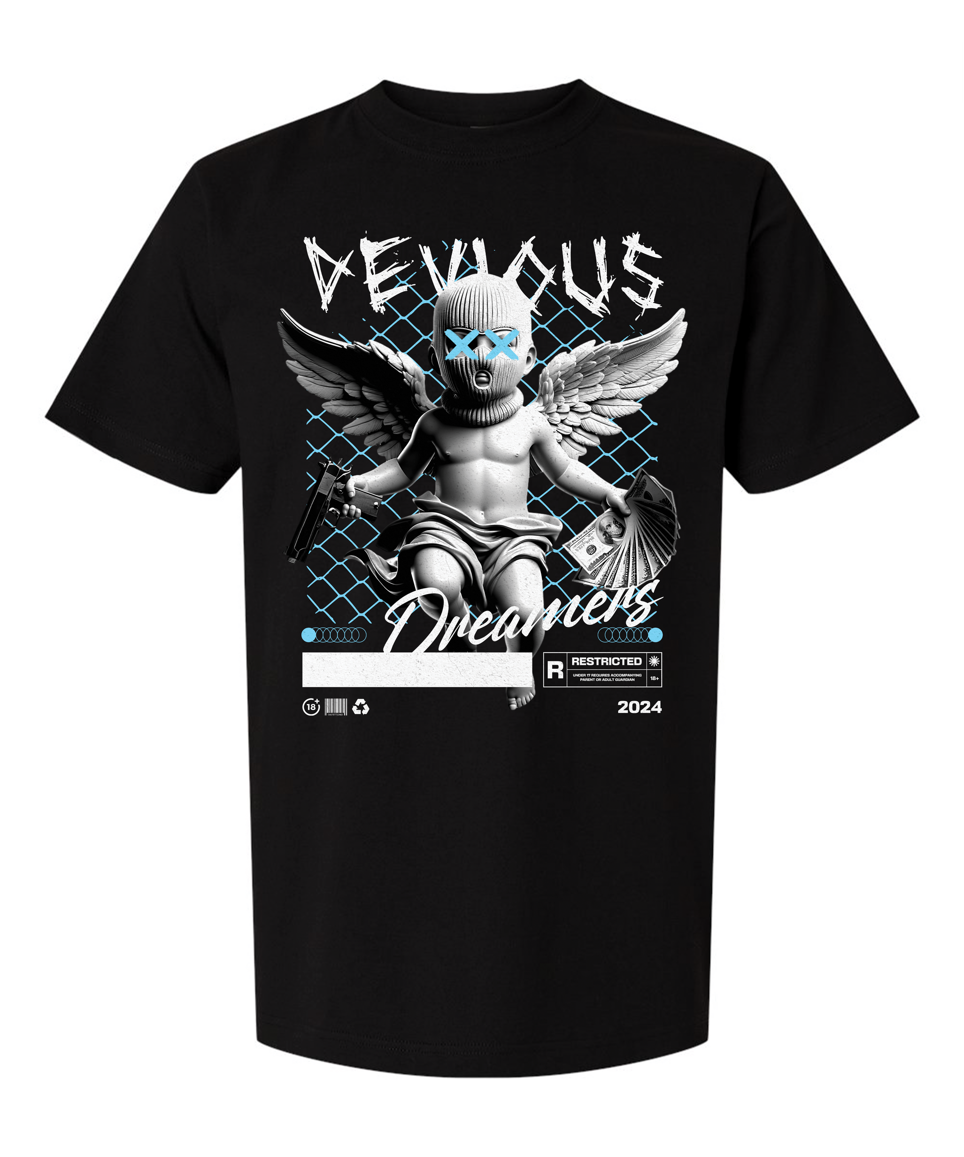The Devious Dreamers "Restricted Angel" Tee is a bold fusion of street art and high-fashion energy. Featuring an angel in a ski mask holding both money and power, this design captures the tension between innocence and hustle — a true statement piece for the culture.