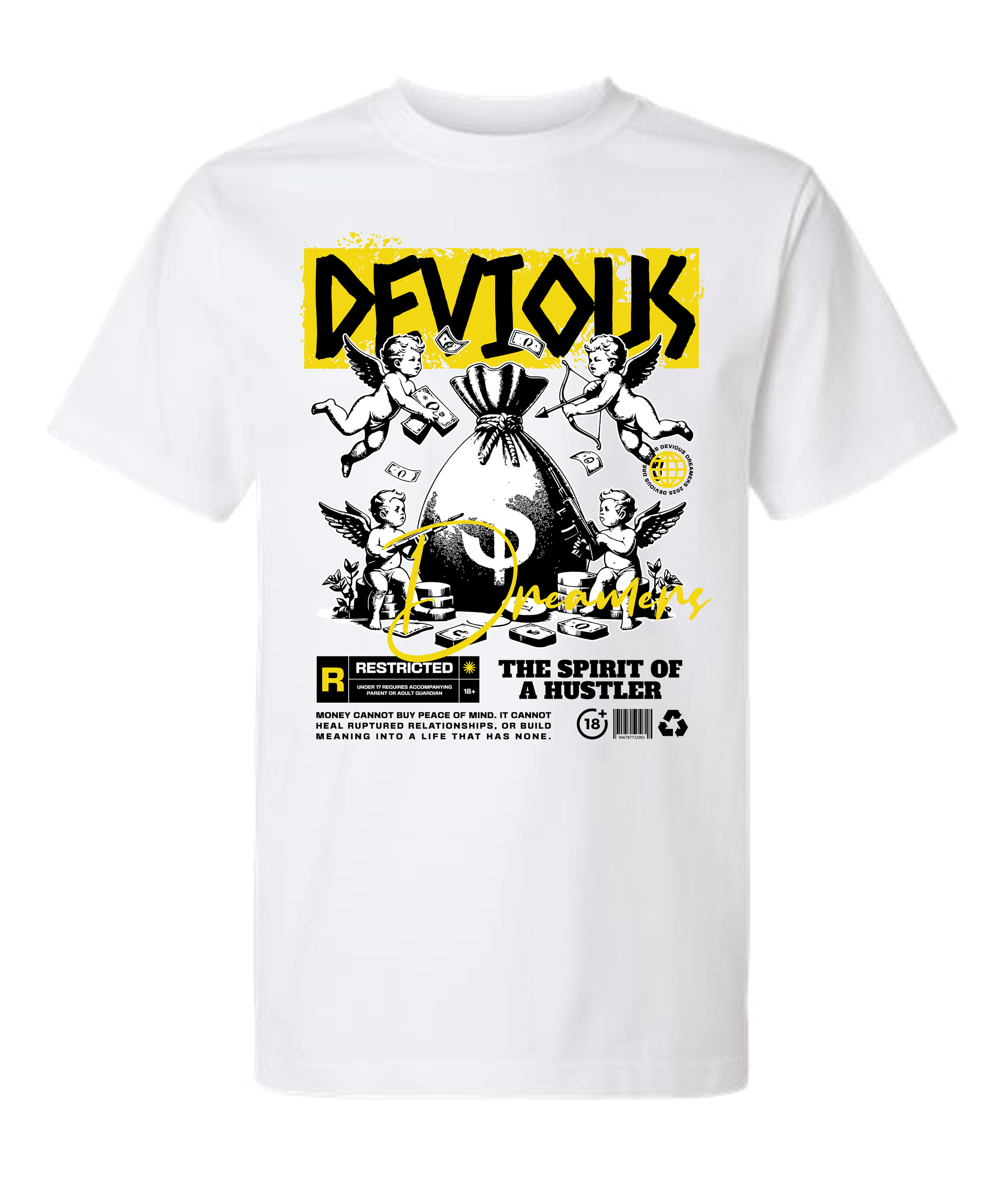 The Devious Dreamers "Spirit of a Hustler" Tee is built for those who live the grind. Featuring angel figures surrounding a massive money bag, bold graphics, and a cinematic “Restricted” style, this tee captures the energy of ambition, rebellion, and resilience.